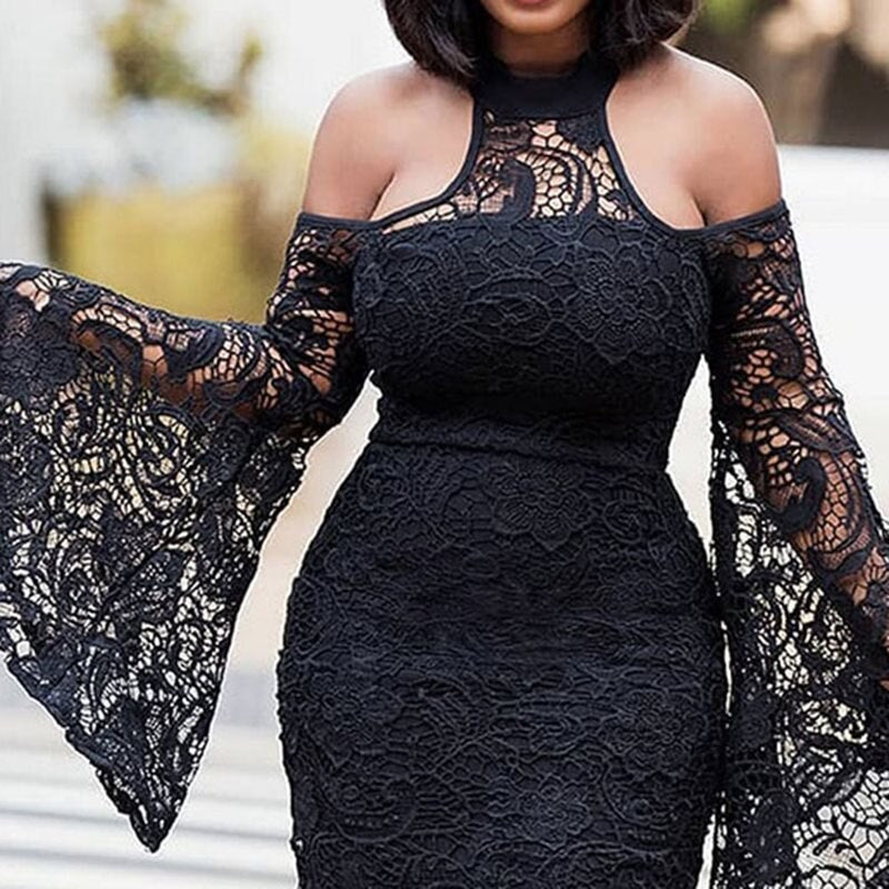 Halter Lace Hook Flower Flare Sleeve Bodycon Dress