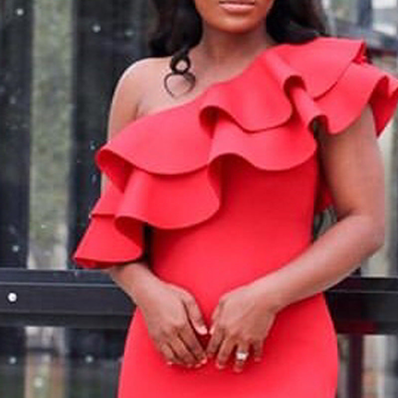 One-Shoulder Sleeveless Mid-Calf Ruffles Bodycon Dress
