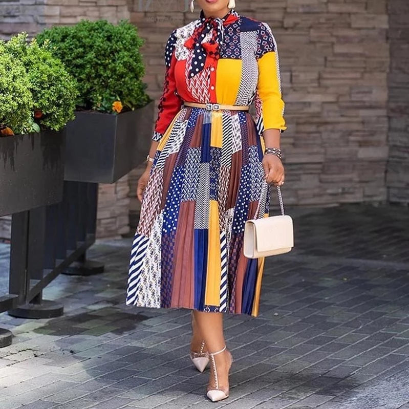 Bow Collar A-Line Color Block Fit And Flare OL Pleated Dress
