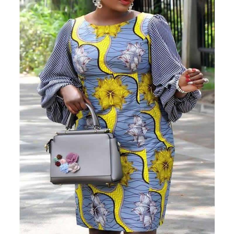 Knee-Length Stripe Lantern Sleeve Floral Print Casual Dress