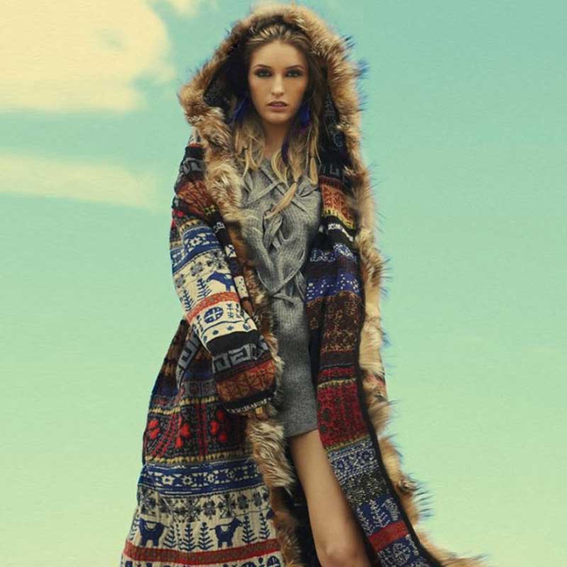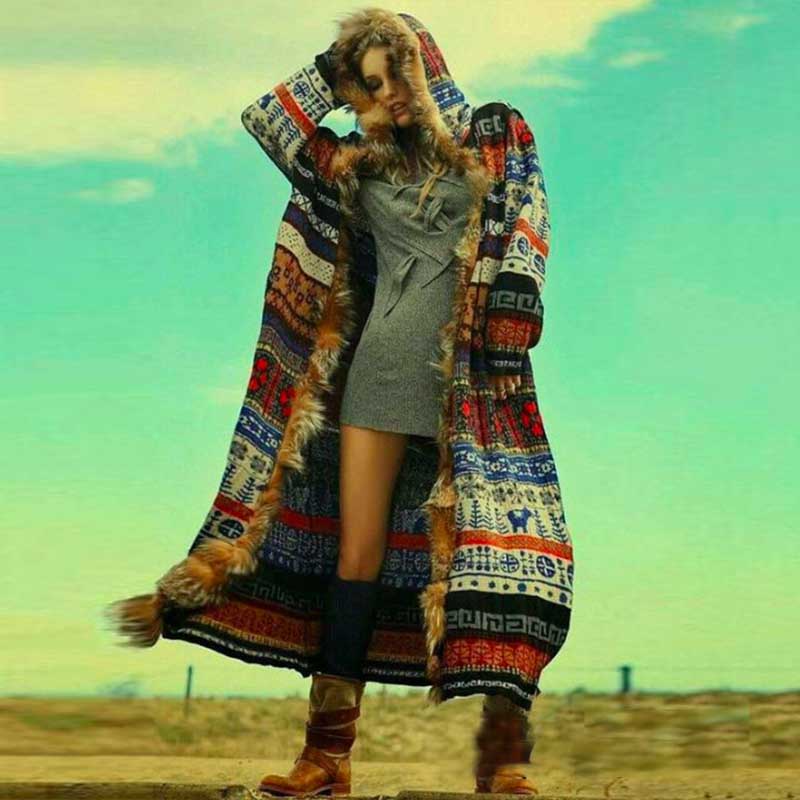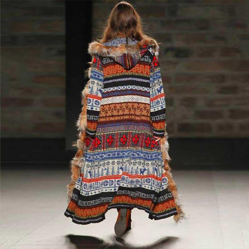 Falbala Knitted Fur Hooded Thicker Plaid Long Coat Outwear