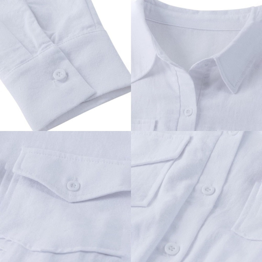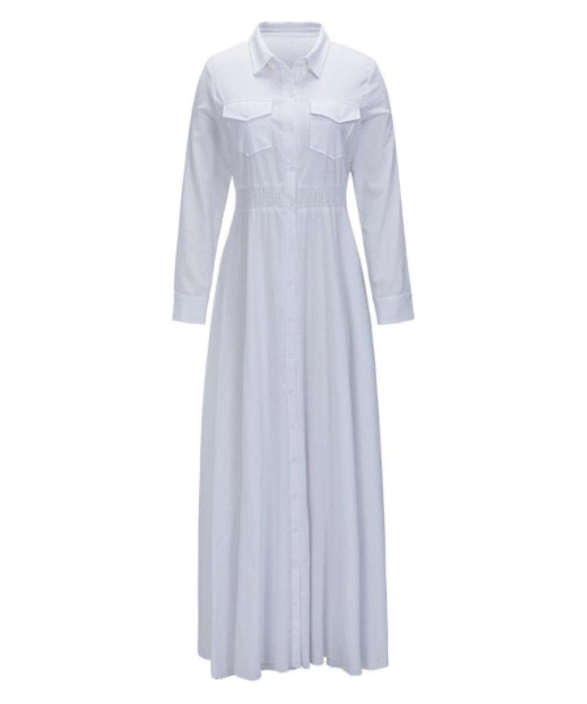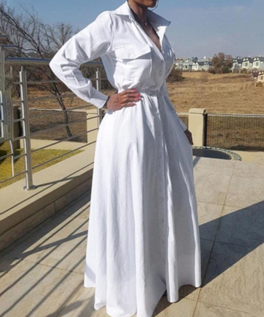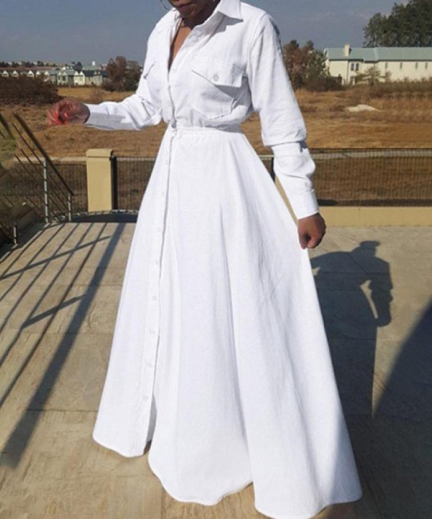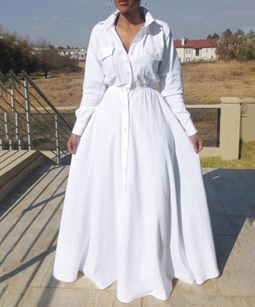 Floor-Length White Shirt Long Sleeve V-Neck Maxi Dress