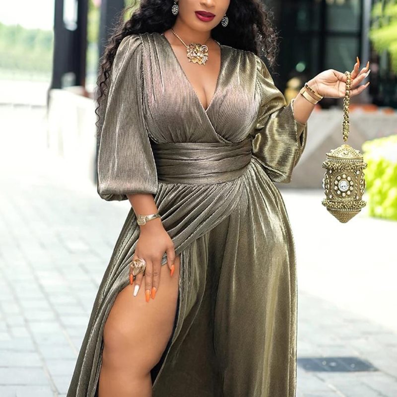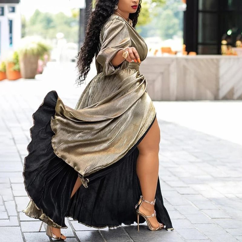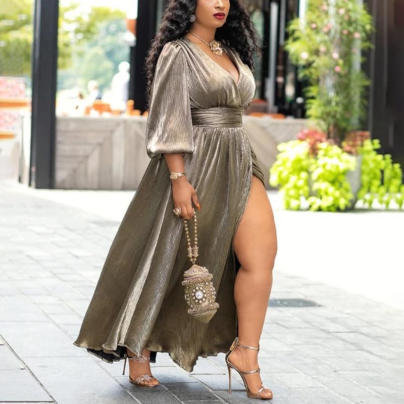 Golden Glitter Split V-Neck High Waist Lantern Sleeve Pleated Maxi Dress