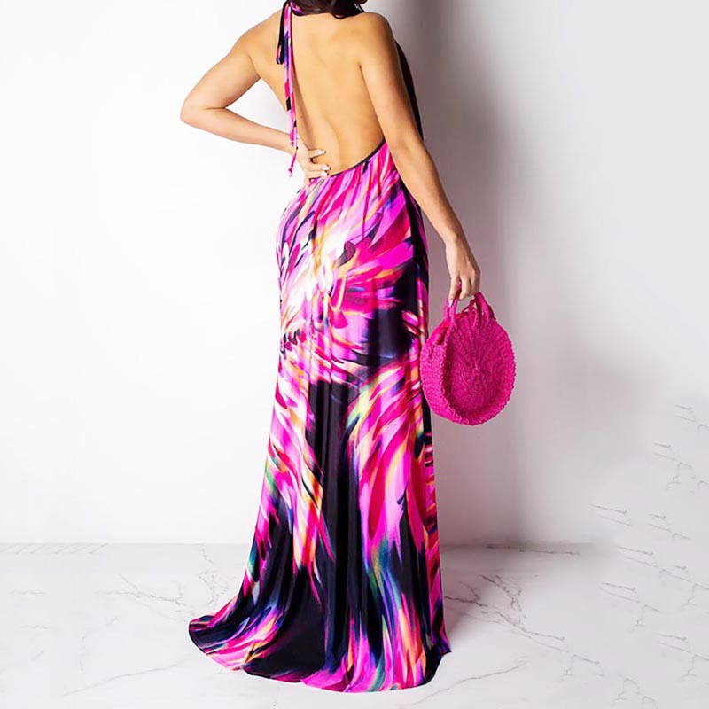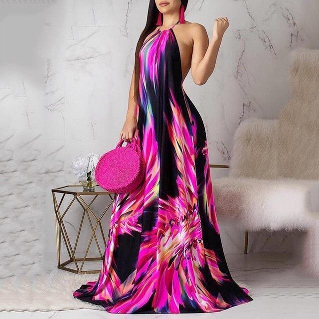 Halter Printed Backless Sleeveless Floor-Length Maxi Dress