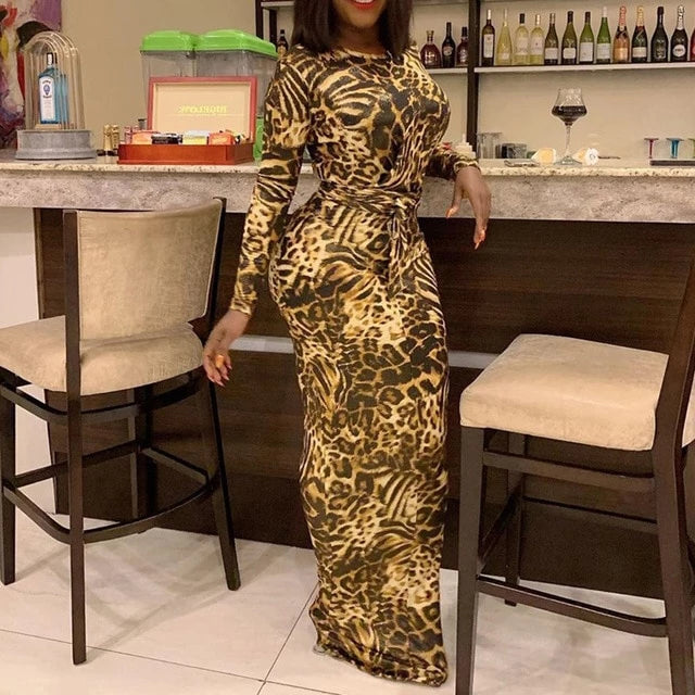 Leopard Printed O-Neck Long Sleeve Bodycon Belted Stretch Maxi Dress