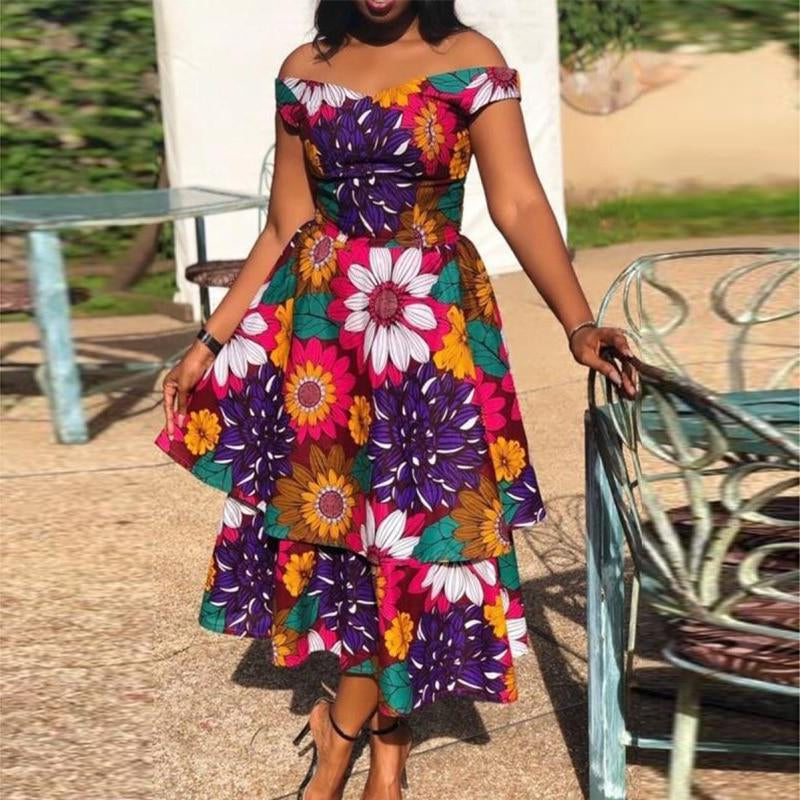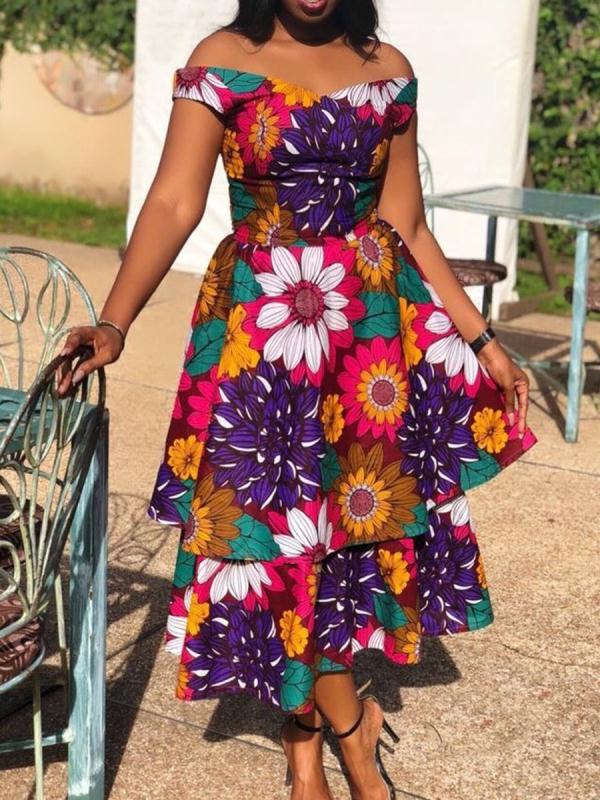 Off Shoulder Mid-Calf Floral Short Sleeve Maxi Dress