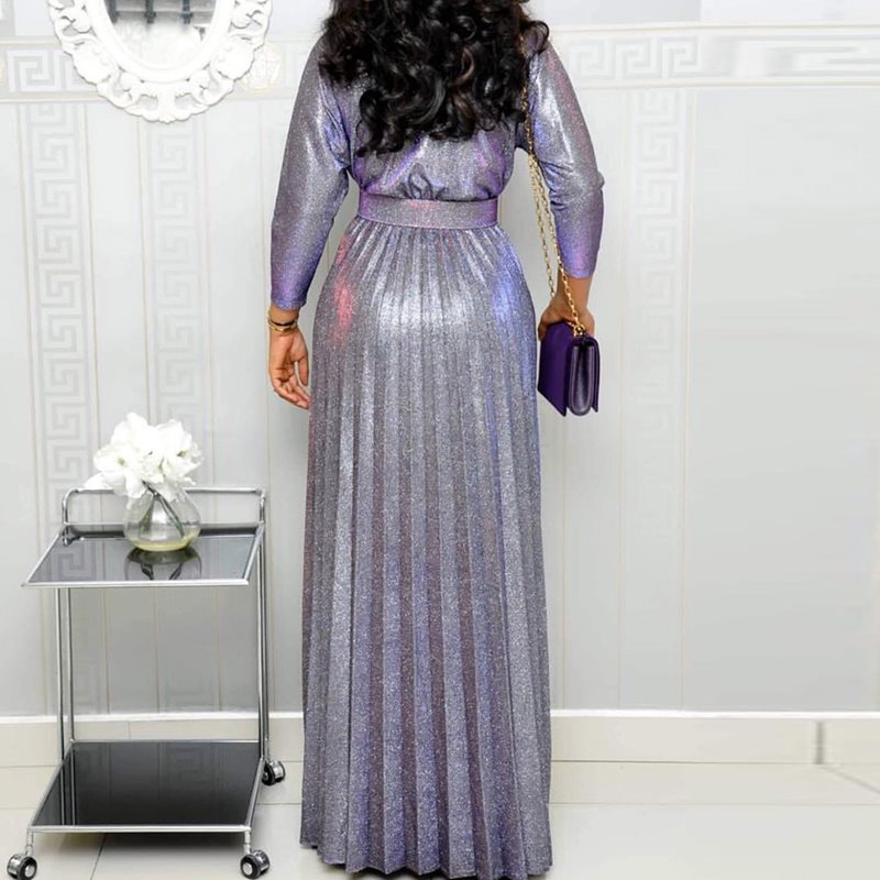 Reflective Pleated V-Neck High Waist Belt Glitter Maxi Dress