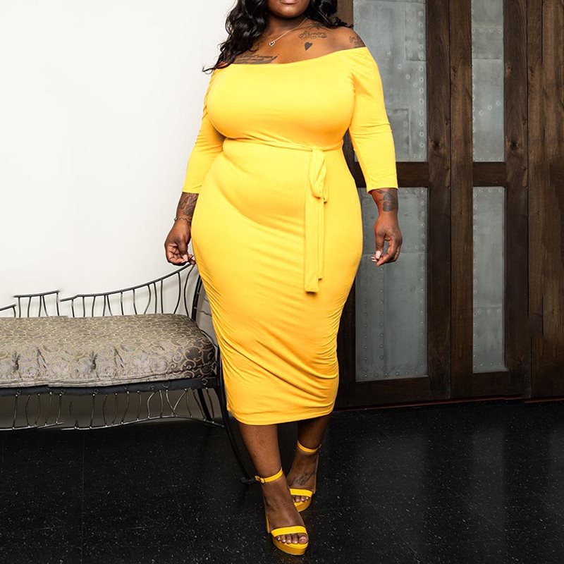 Solid Slash Neck Mid-Calf High Waist Bodycon Maxi Dress