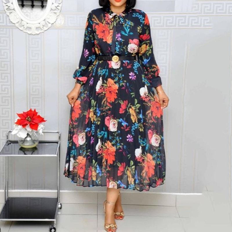 Mid-Calf Nine Points Sleeve Floral Pleated Bow Neck Midi Dress