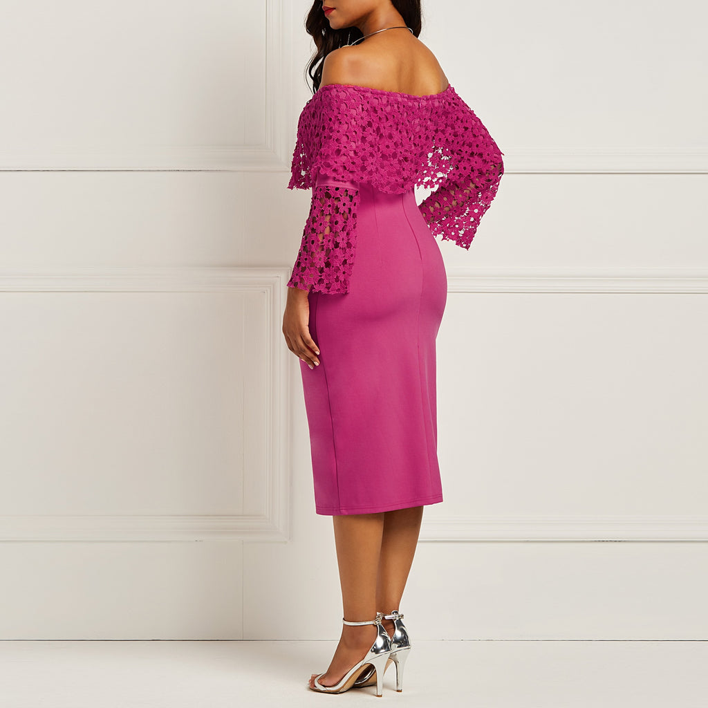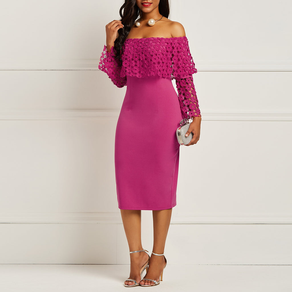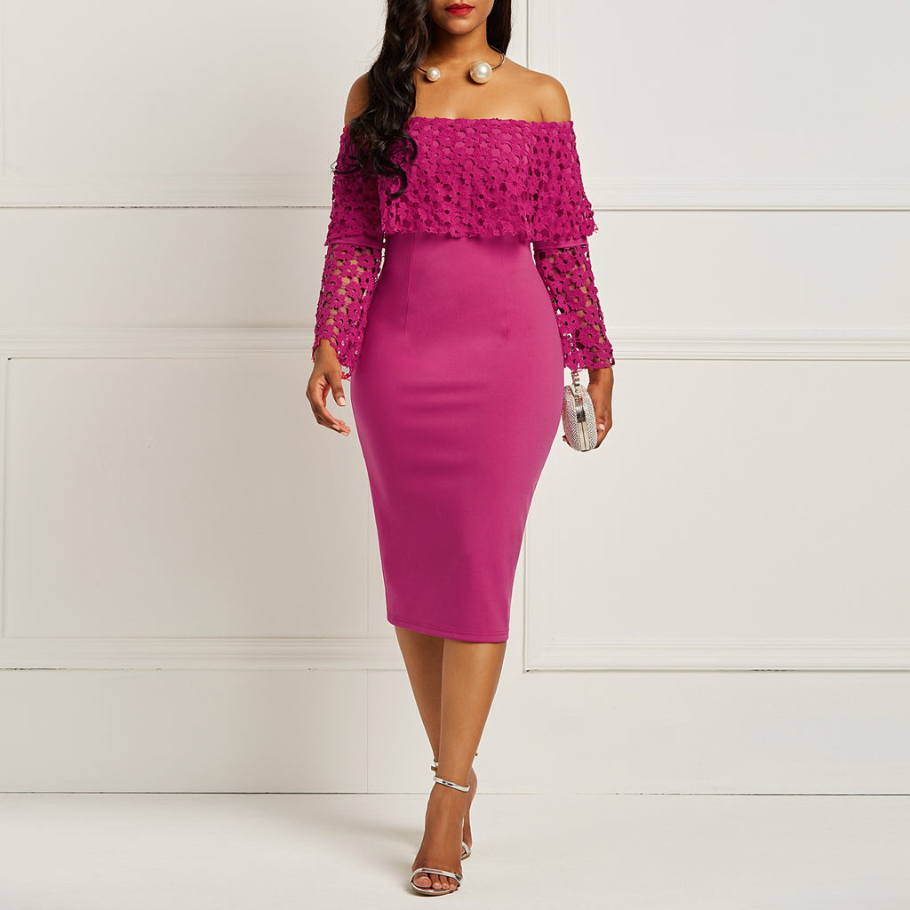 Off Shoulder Flower Retro Hollow Ruffle Bodycon Midi Dress