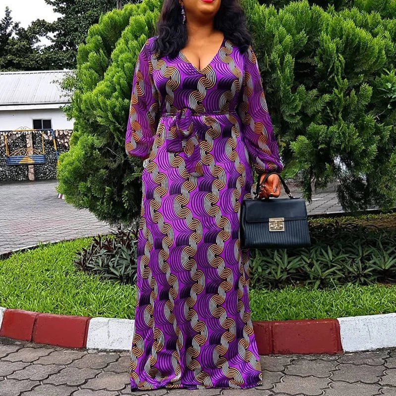 V-Neck A-Line Floor-Length Lace-up Flower Printing Maxi Dress