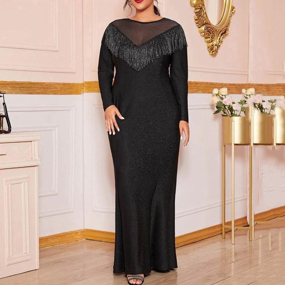 Backless Plus Size Long Sleeve O-Neck Tassel Standard-Waist Dress
