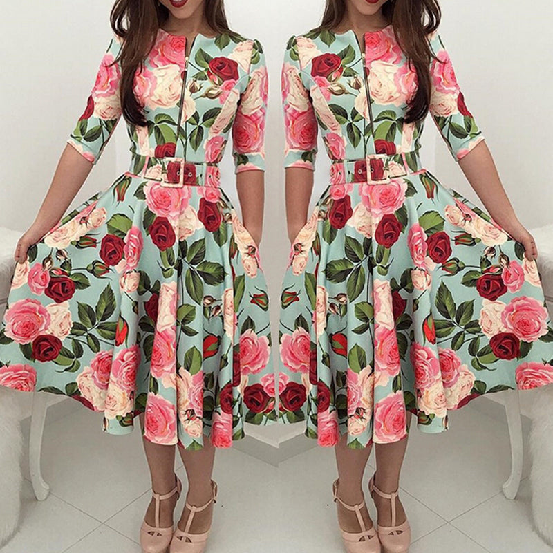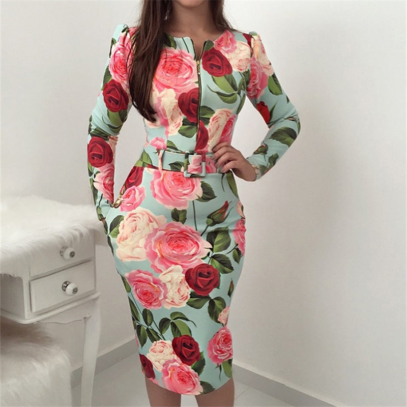 O-Neck Floral Print Pencil Zip Waistband Print Dress