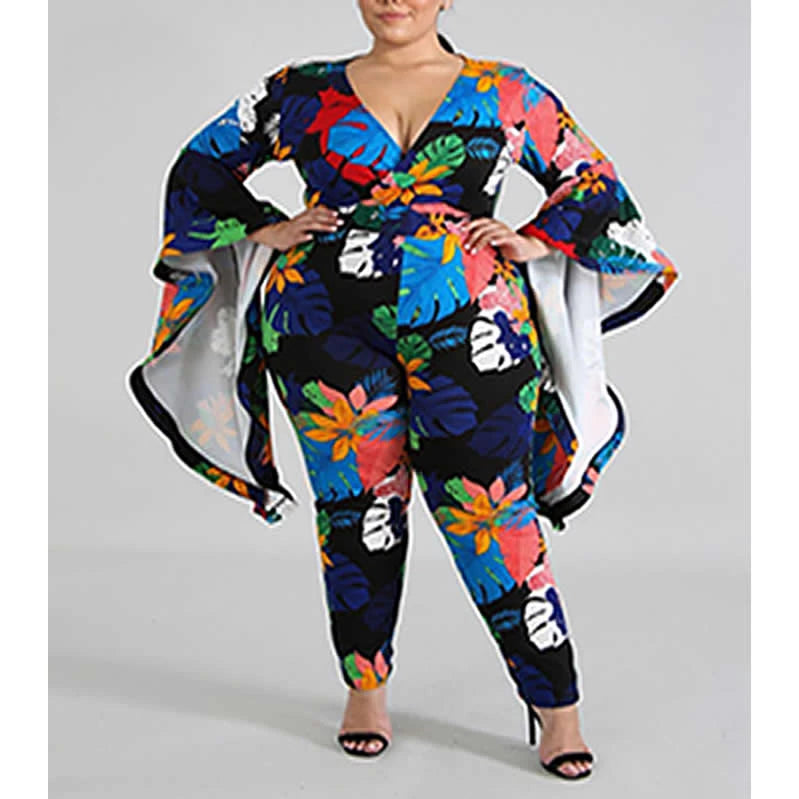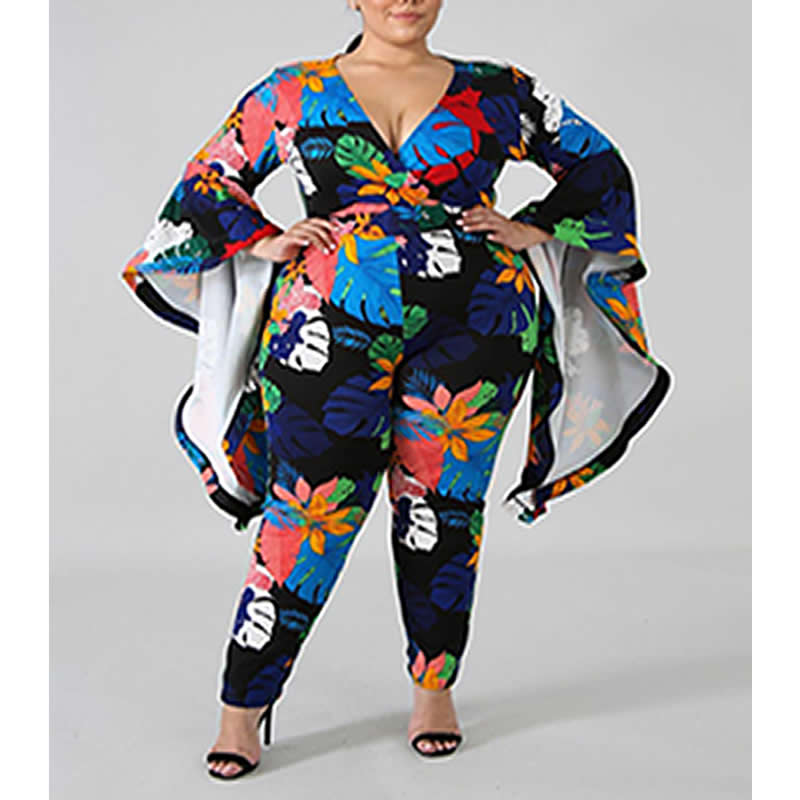Colorful Leaf Printed High Waist Butterfly Sleeve Pencil Jumpsuit
