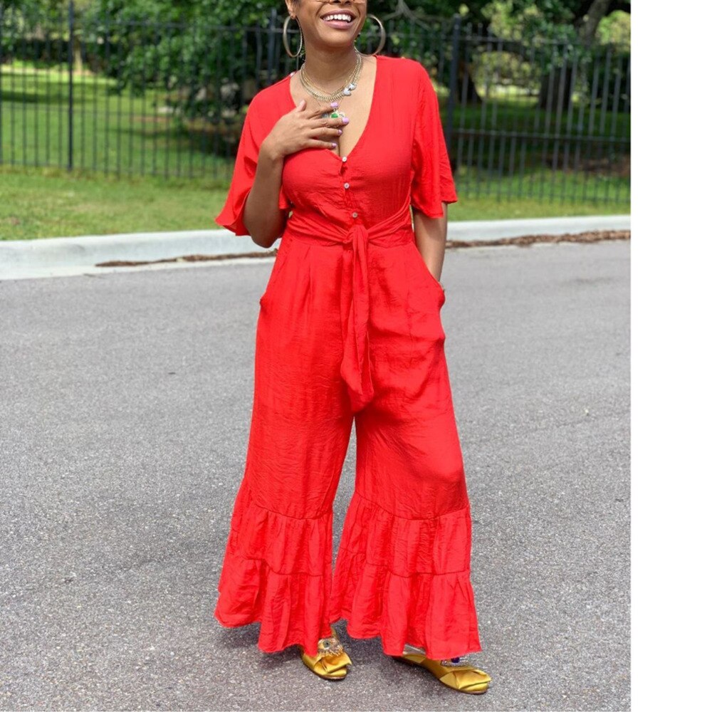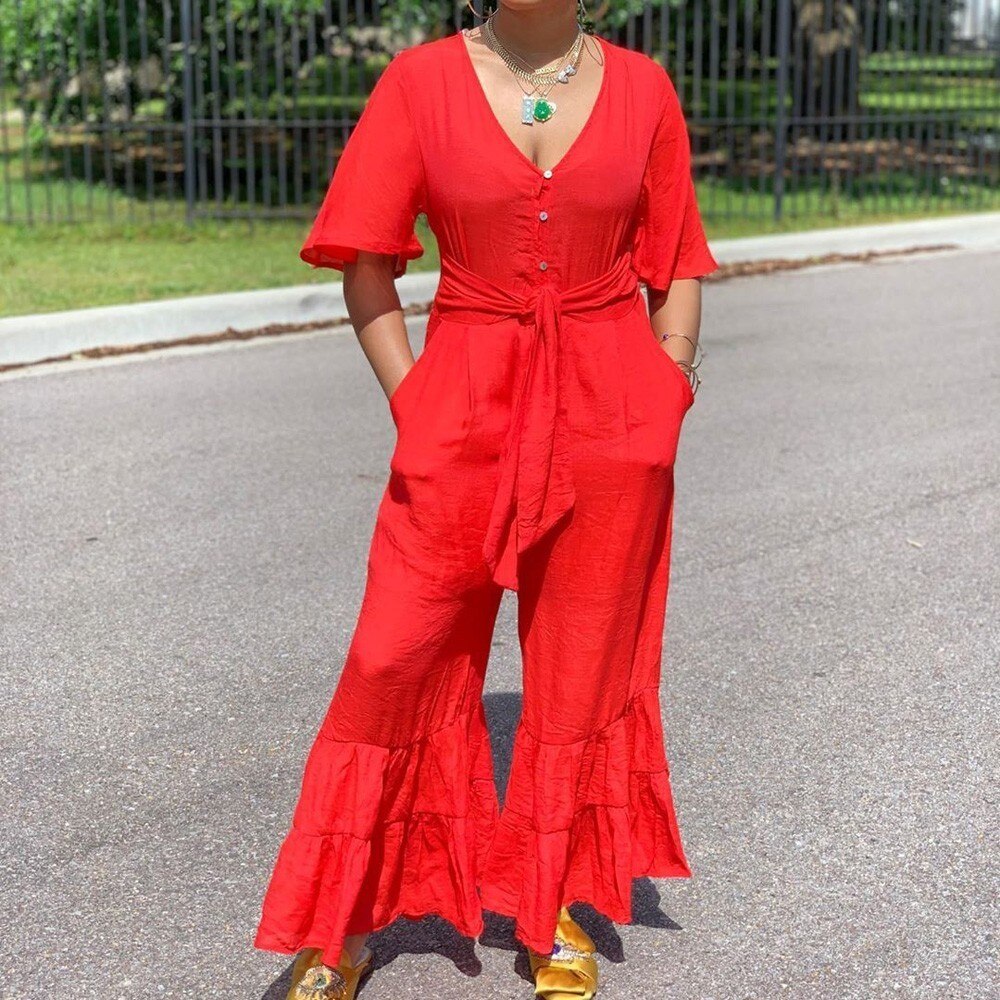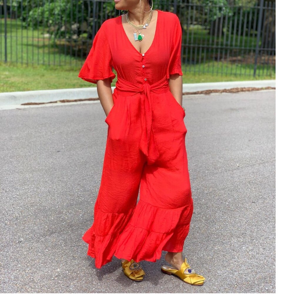One Piece V-Neck Short Sleeve Wide Leg Jumpsuit Overalls