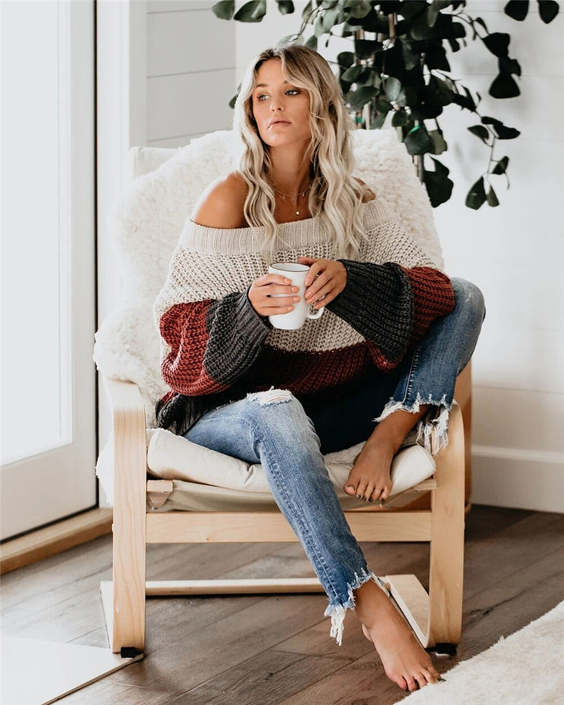 Slash Neck Off Shoulder Striped Knitted Sweater