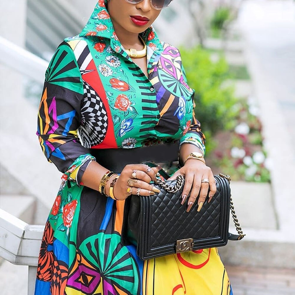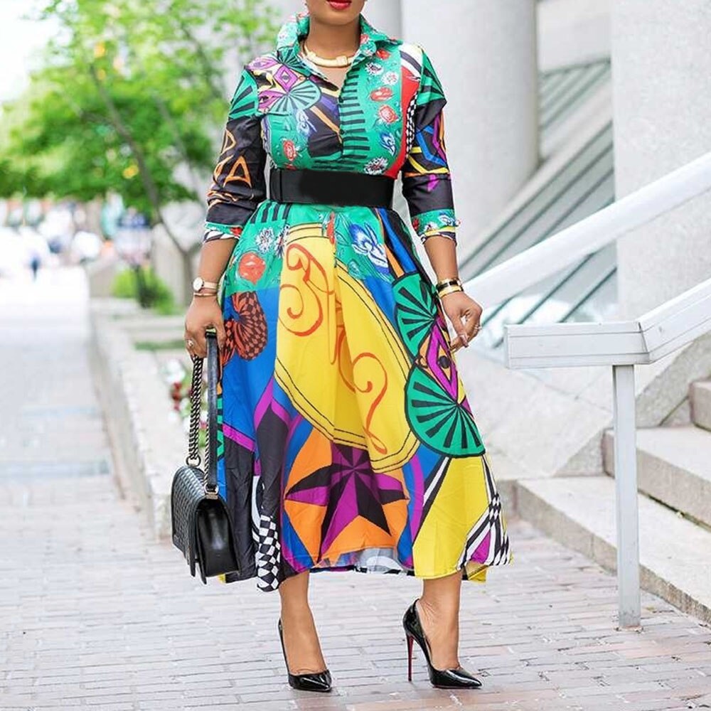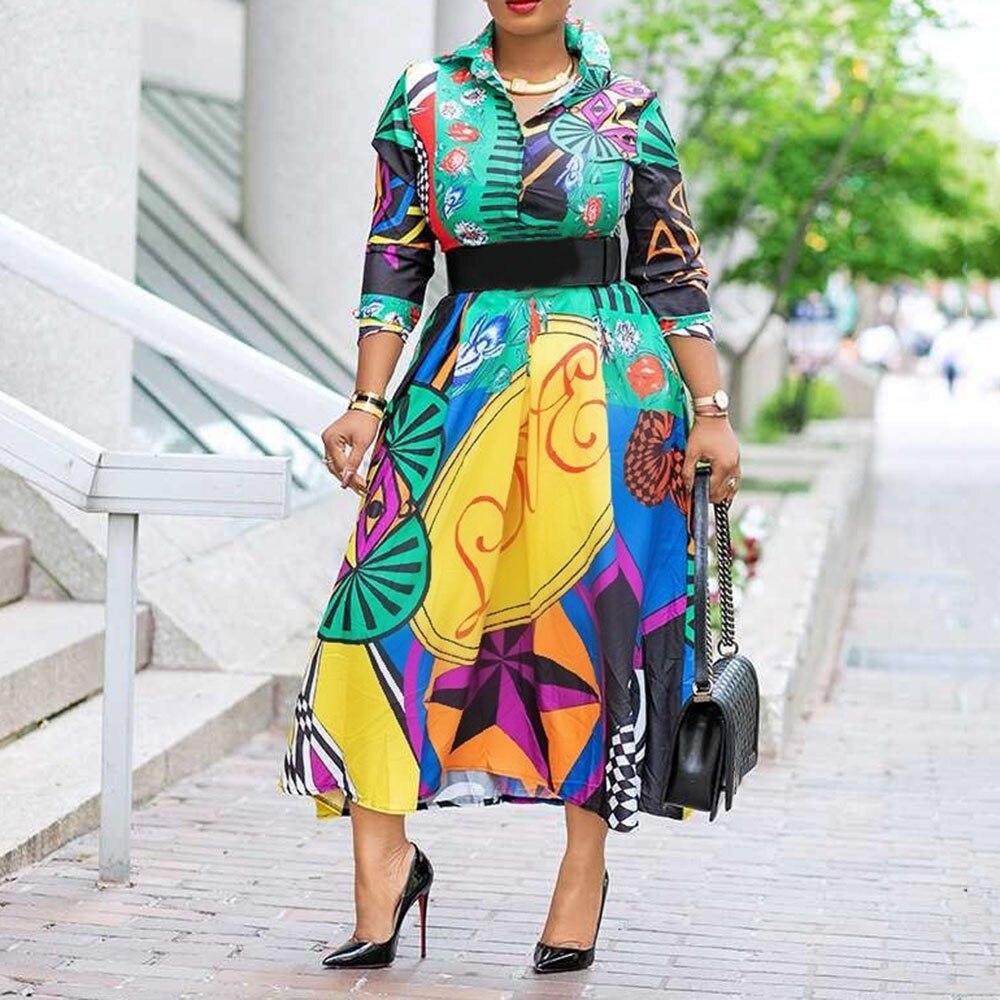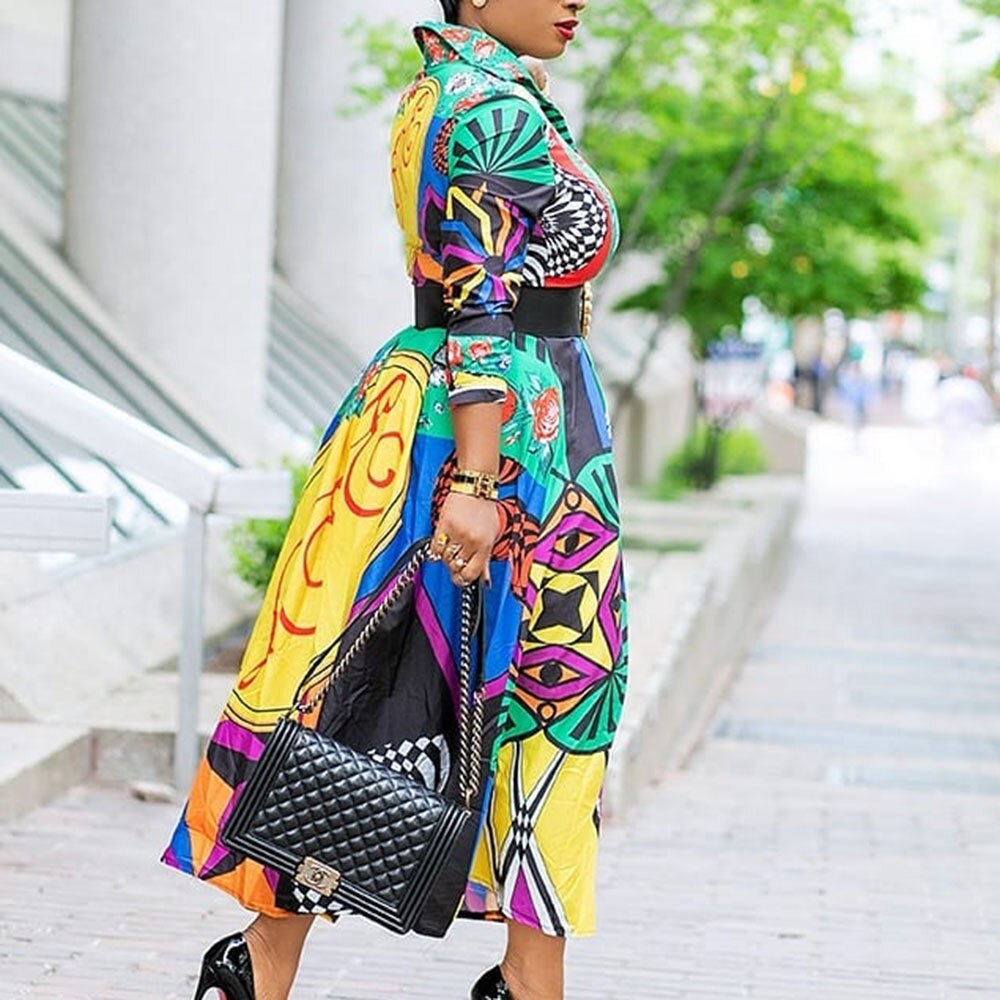 Color Block Printed Mid-Calf High Waist Long Sleeve A-Line Midi Dress