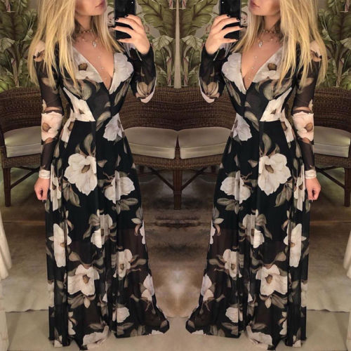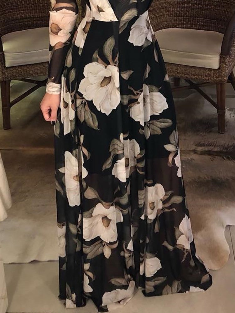 Floral Chic Print V Neck Long Sleeve Maxi Dress