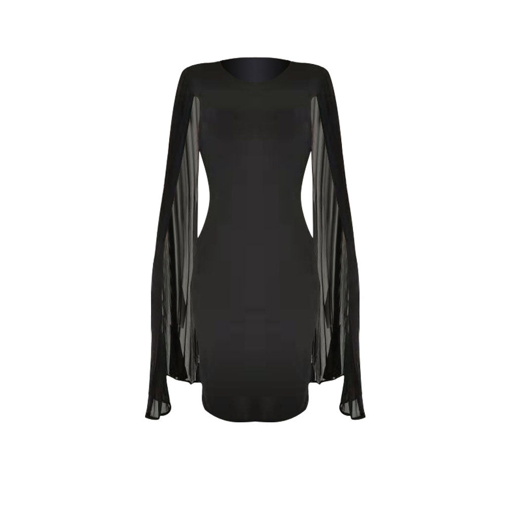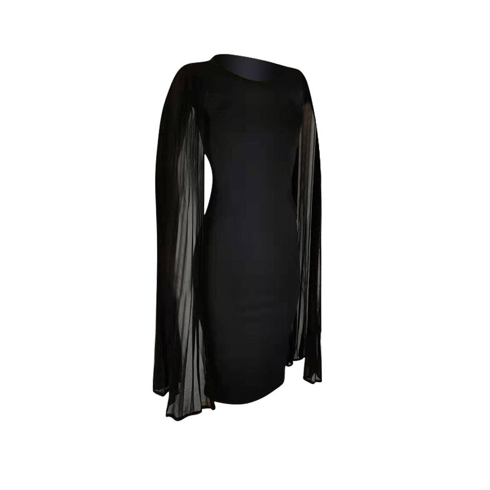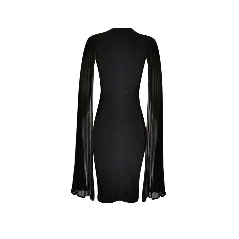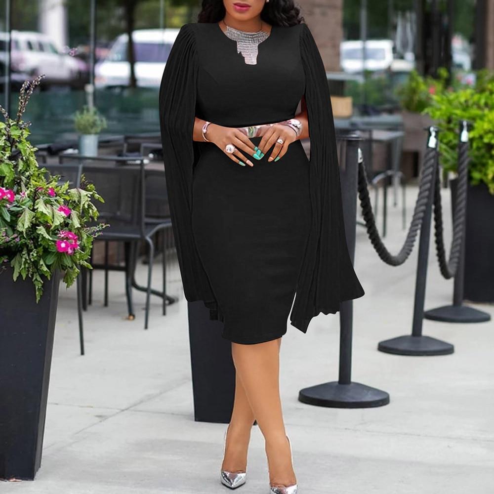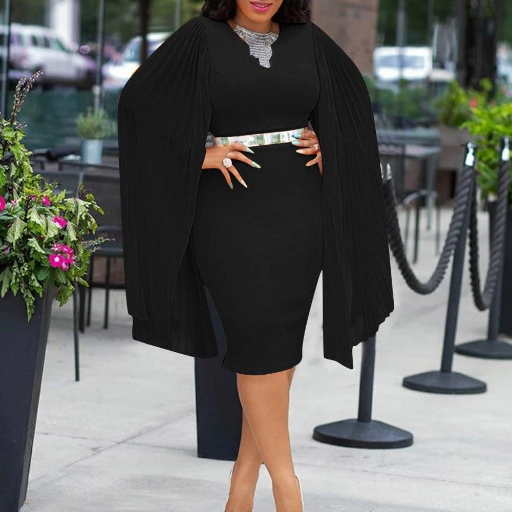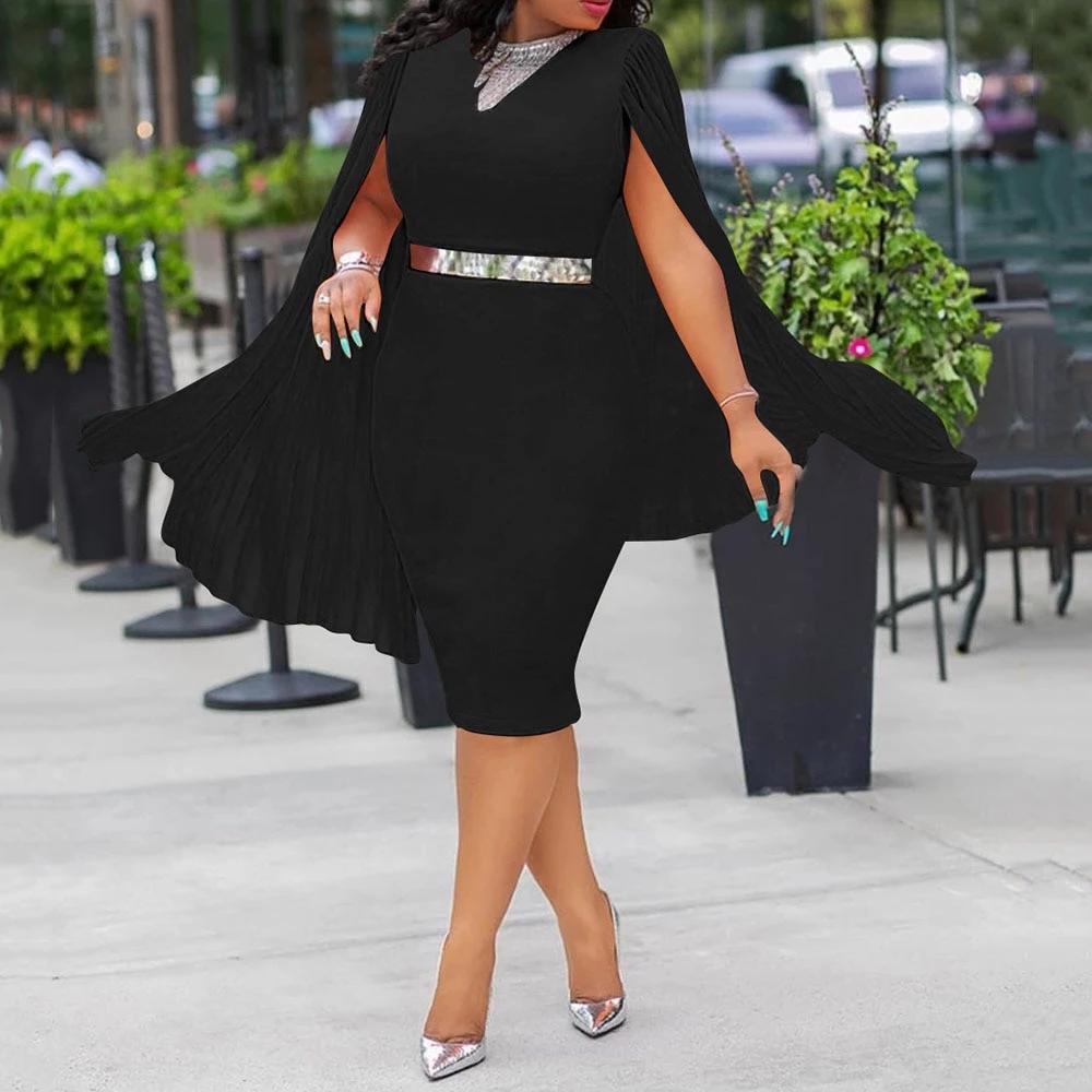 Pleated High Waist Cape Long Sleeve Mid-Calf Plain Pullover Dress