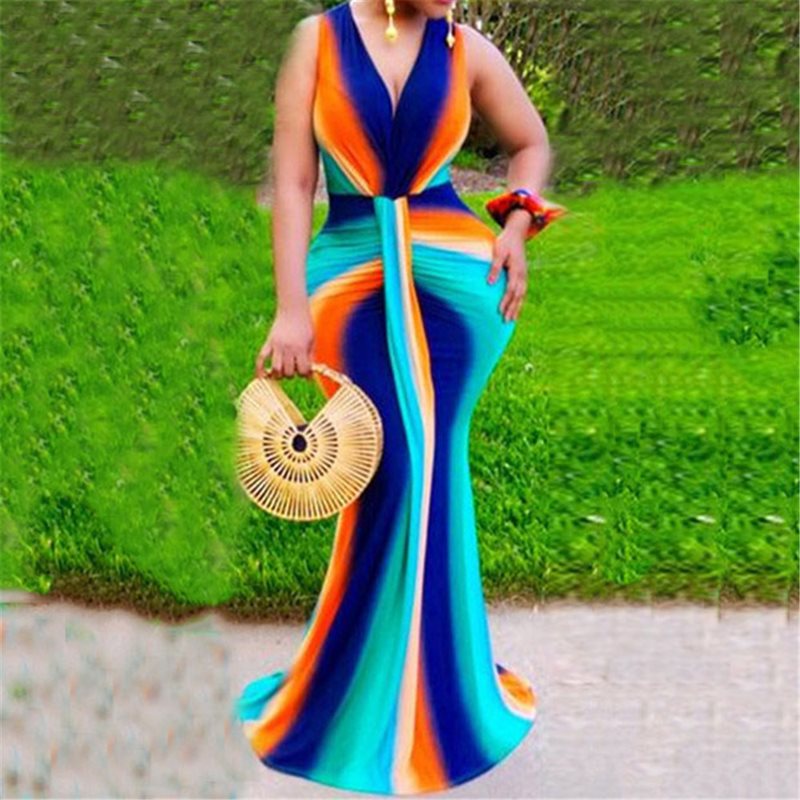 Color Block Floor-Length Deep V Neck Sleeveless Mermaid Maxi Dress