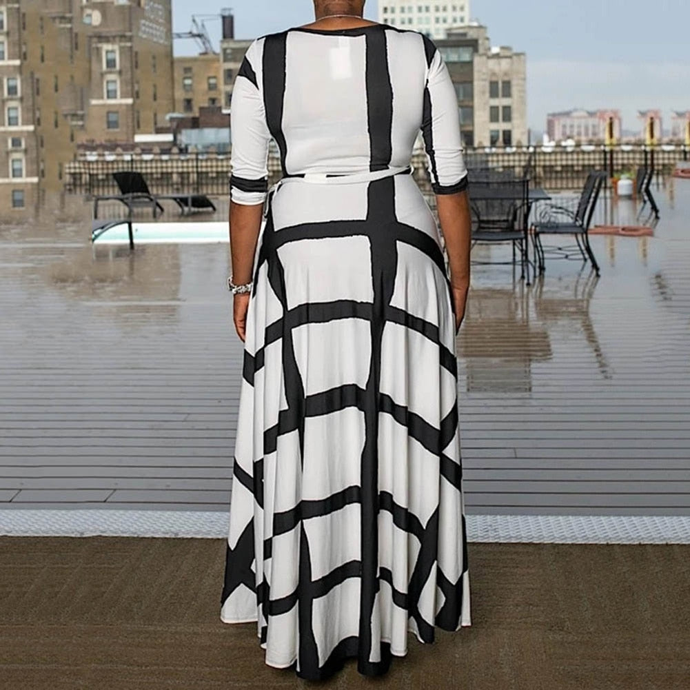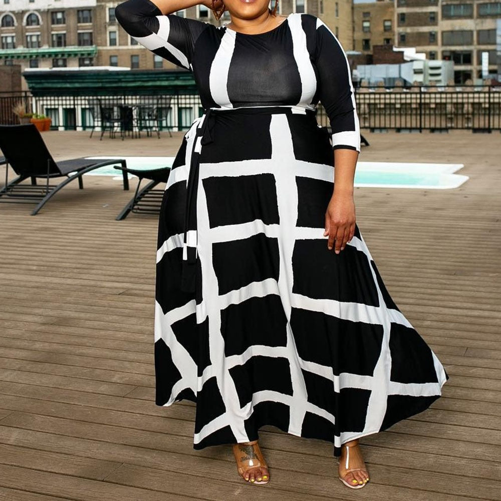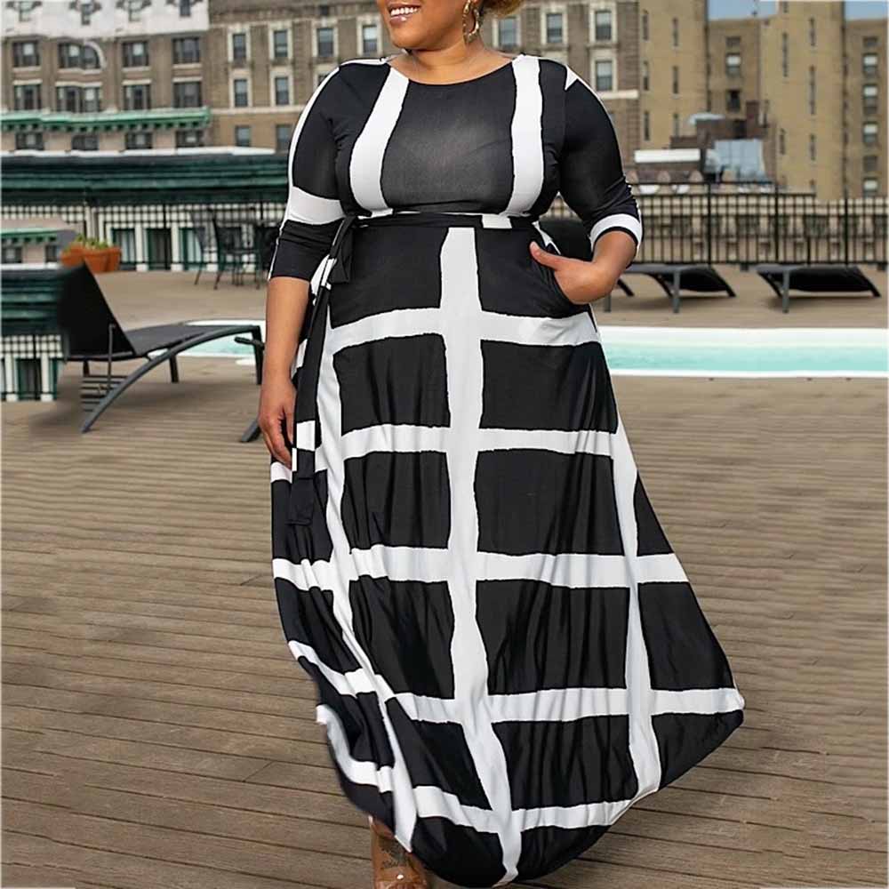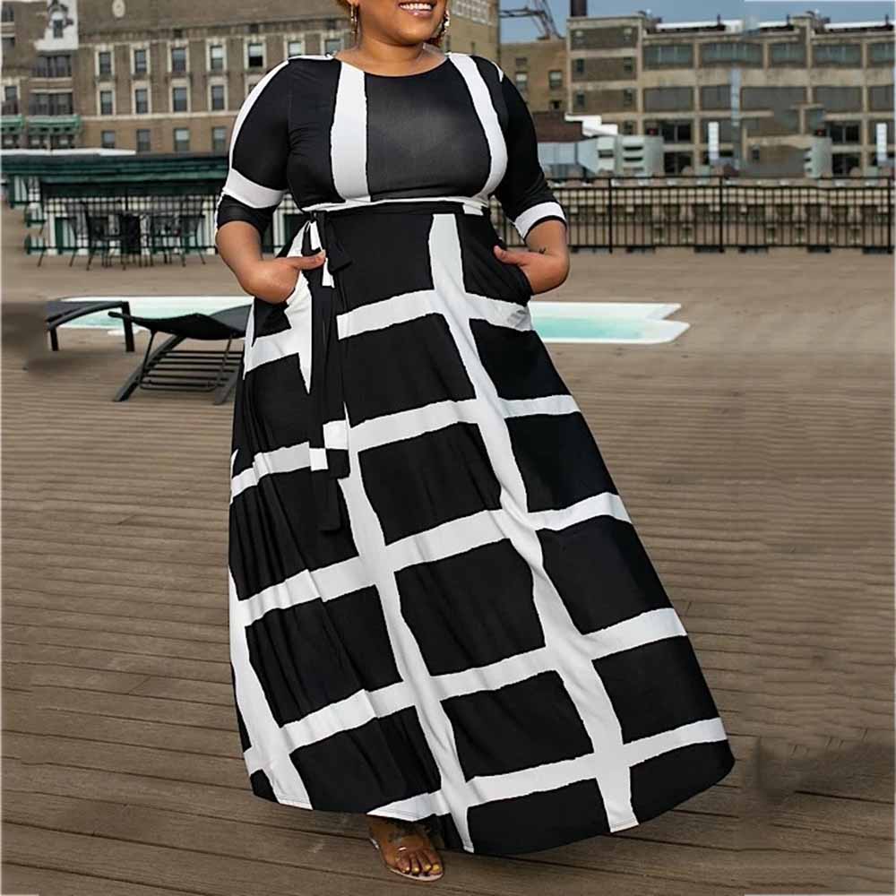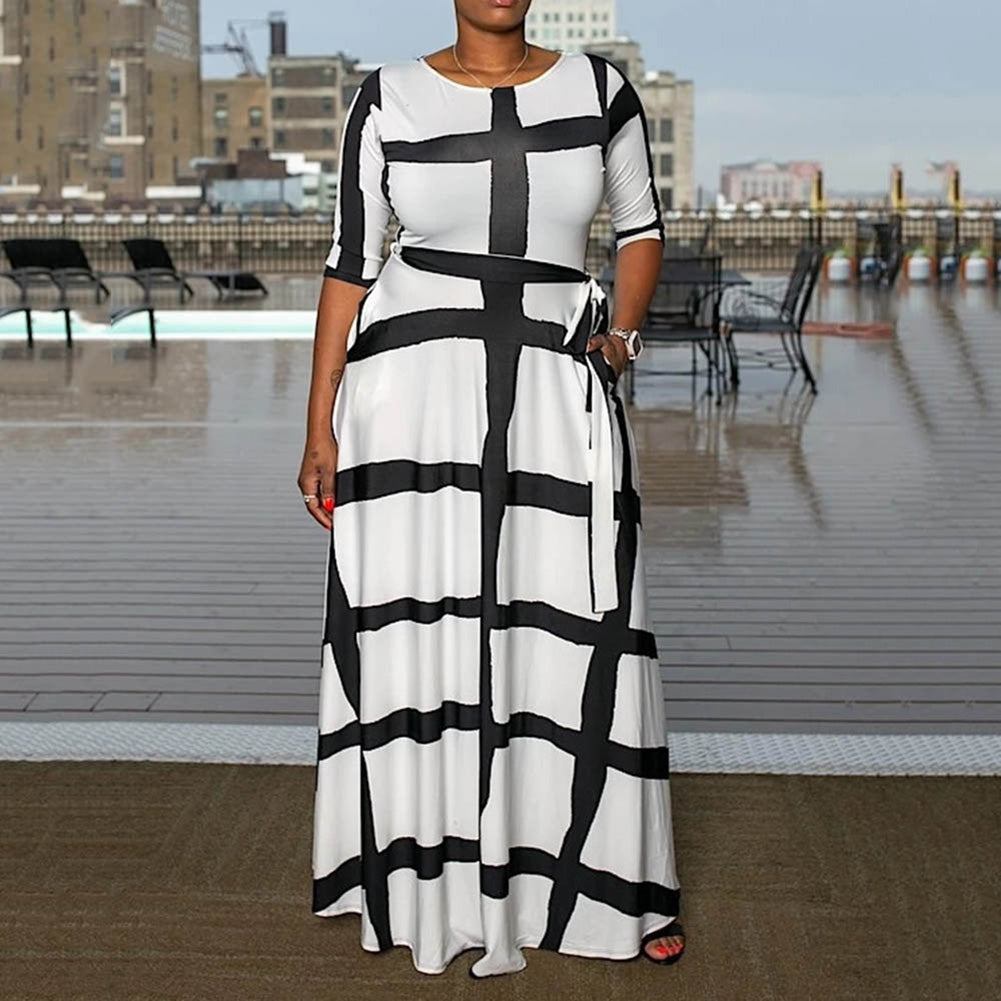 Plaid Striped Three-Quarter Sleeve Ankle-Length Women's Maxi Dress