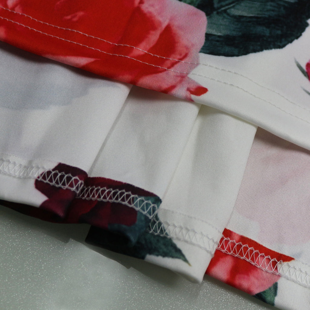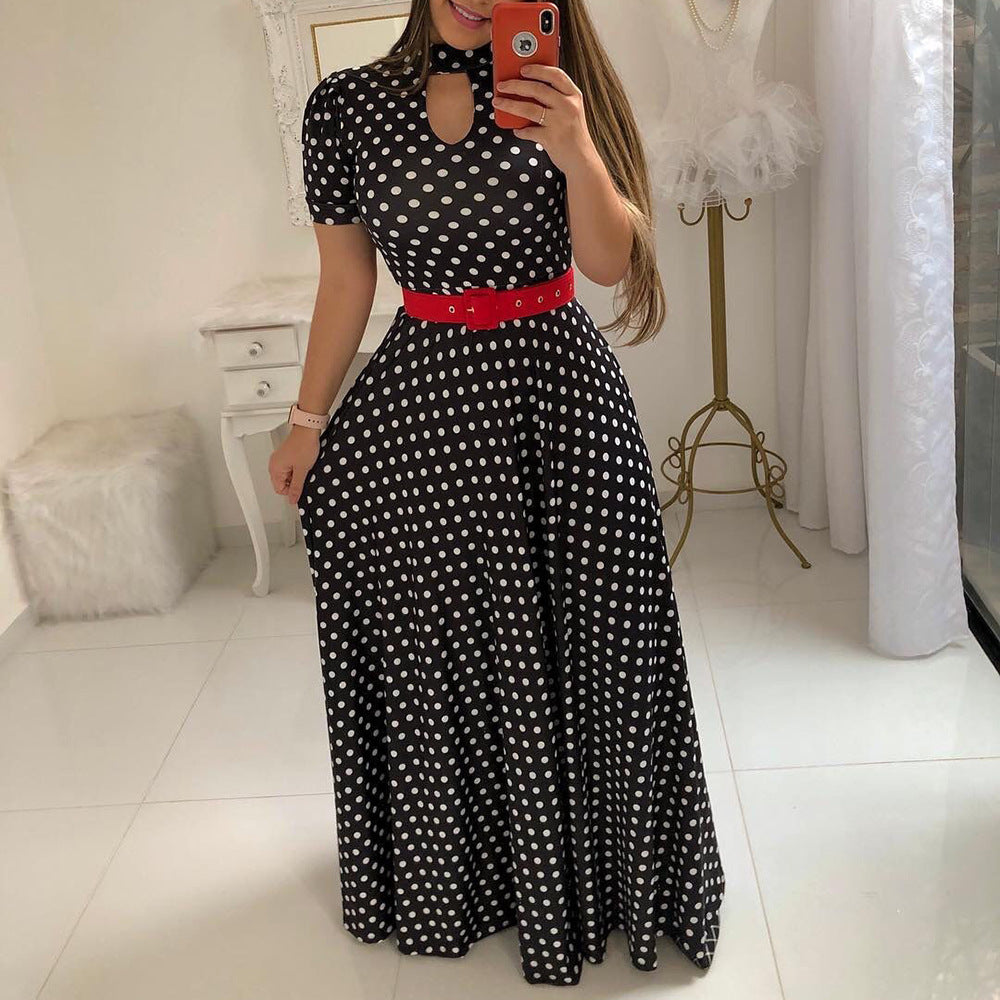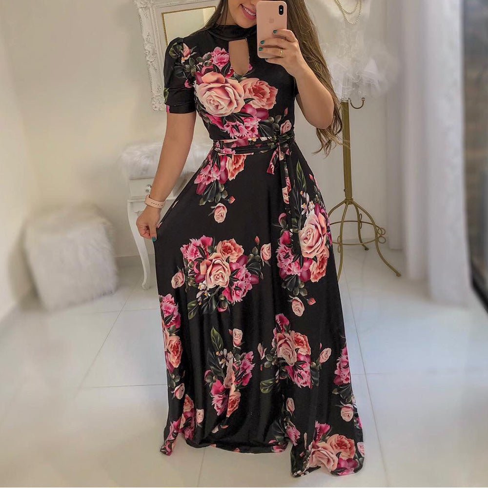 Short Sleeve Hollow Turtleneck Flower Printing Wrap Belt Maxi Dress