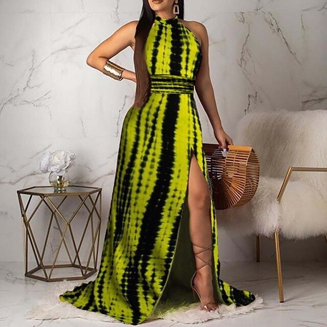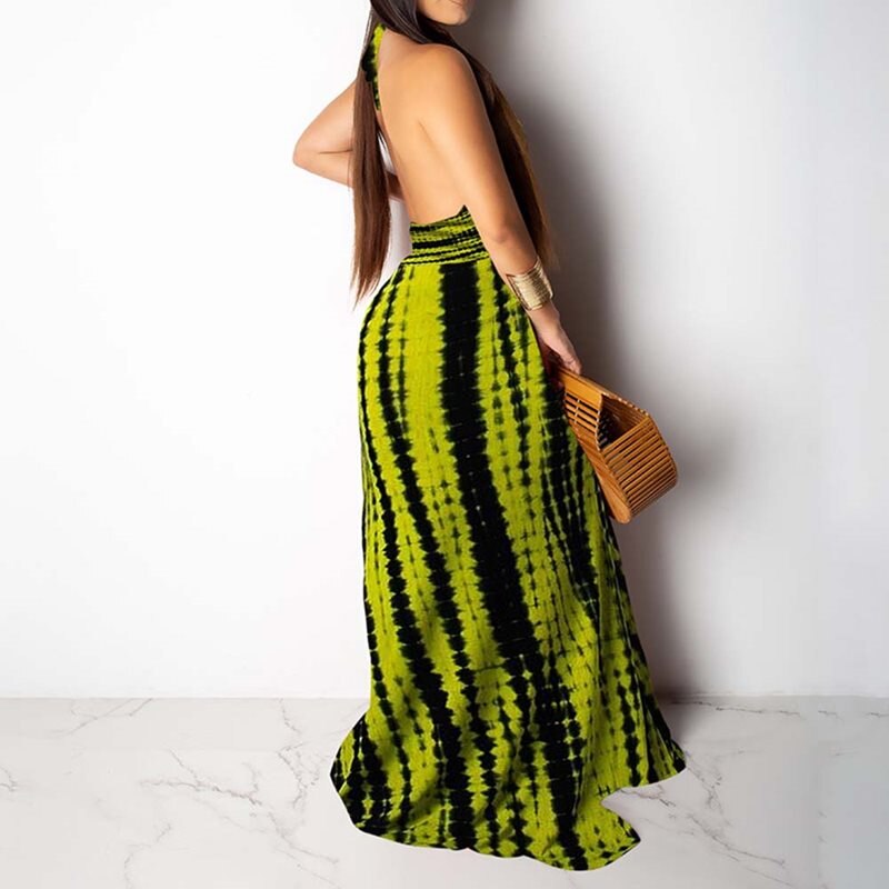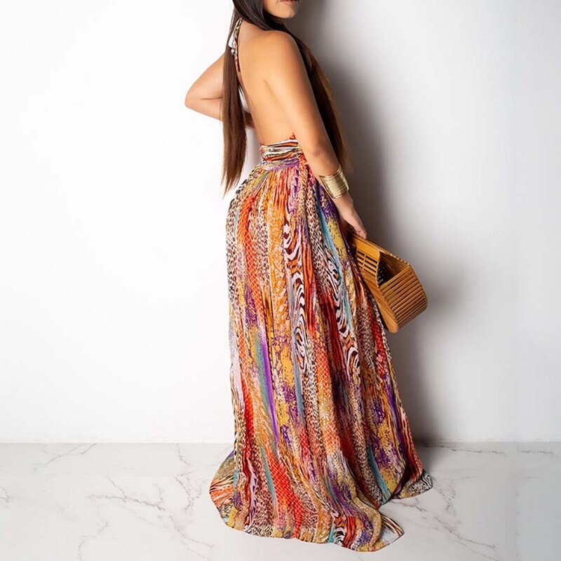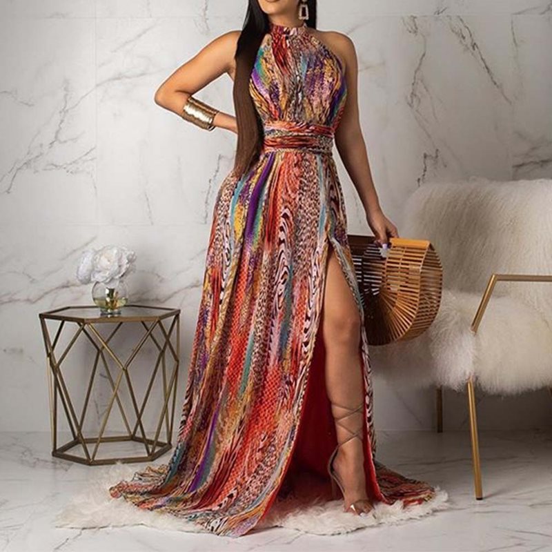Sleeveless A-line Backless Lace Up Print Halter Long Maxi Dress