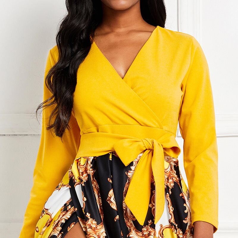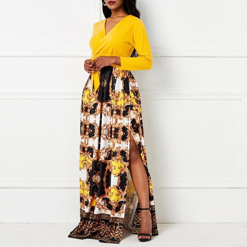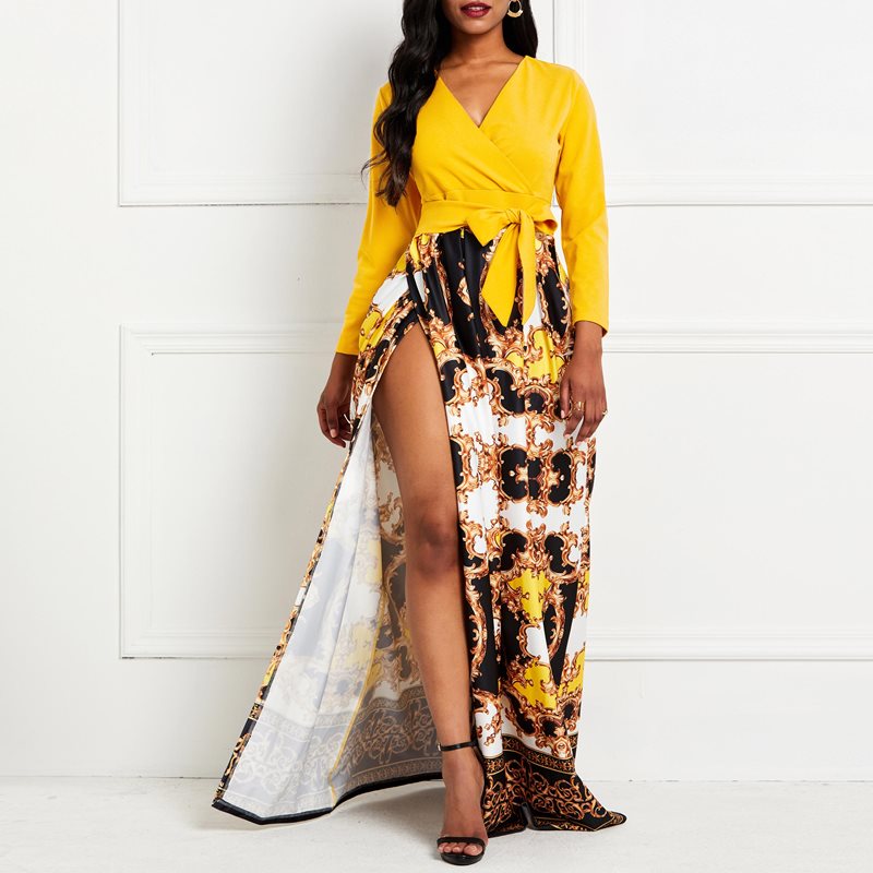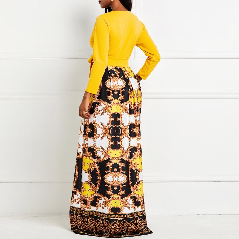 Three-Quarter Sleeve V-Neck Patchwork Split Lace Up Maxi Dress